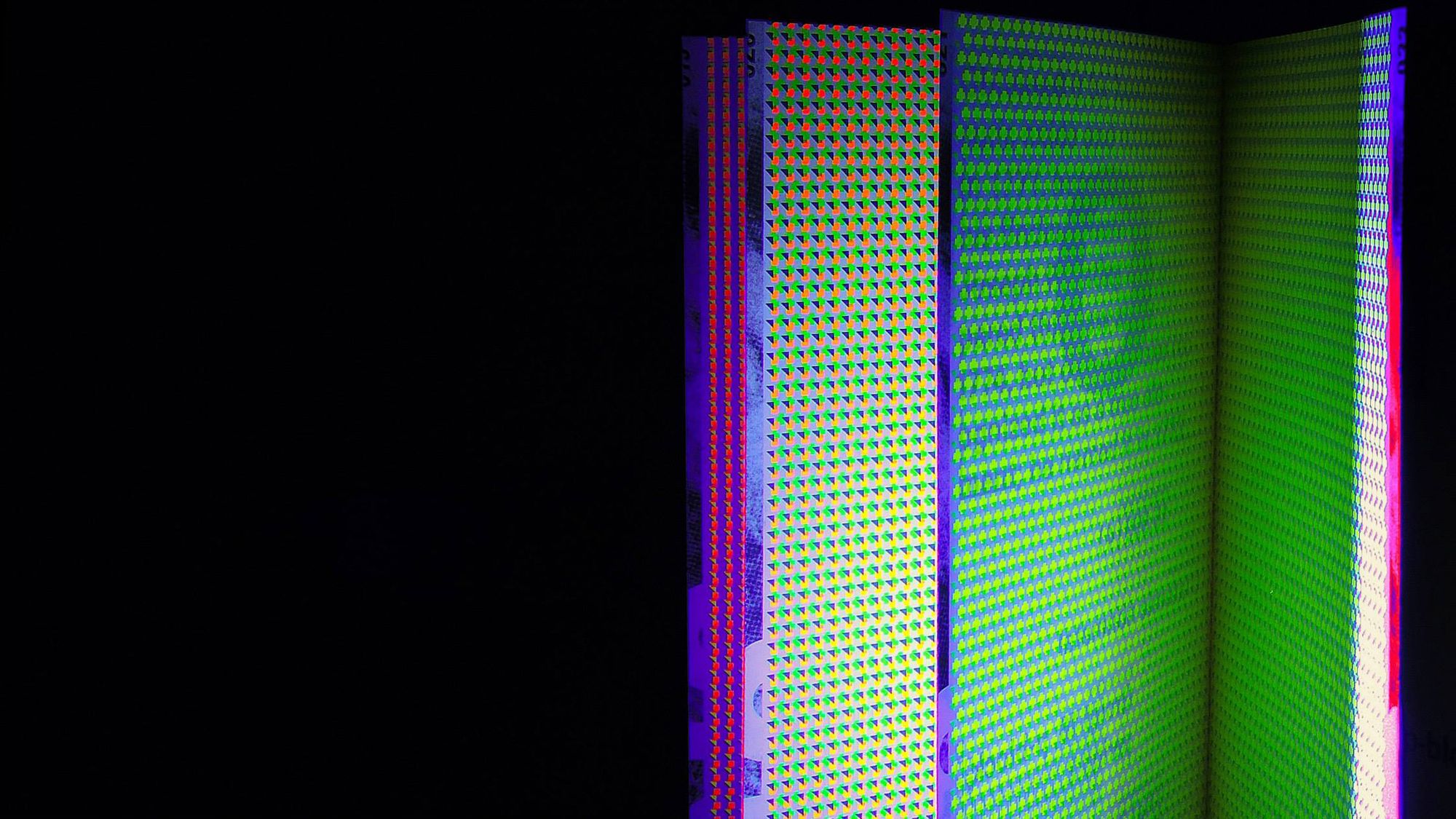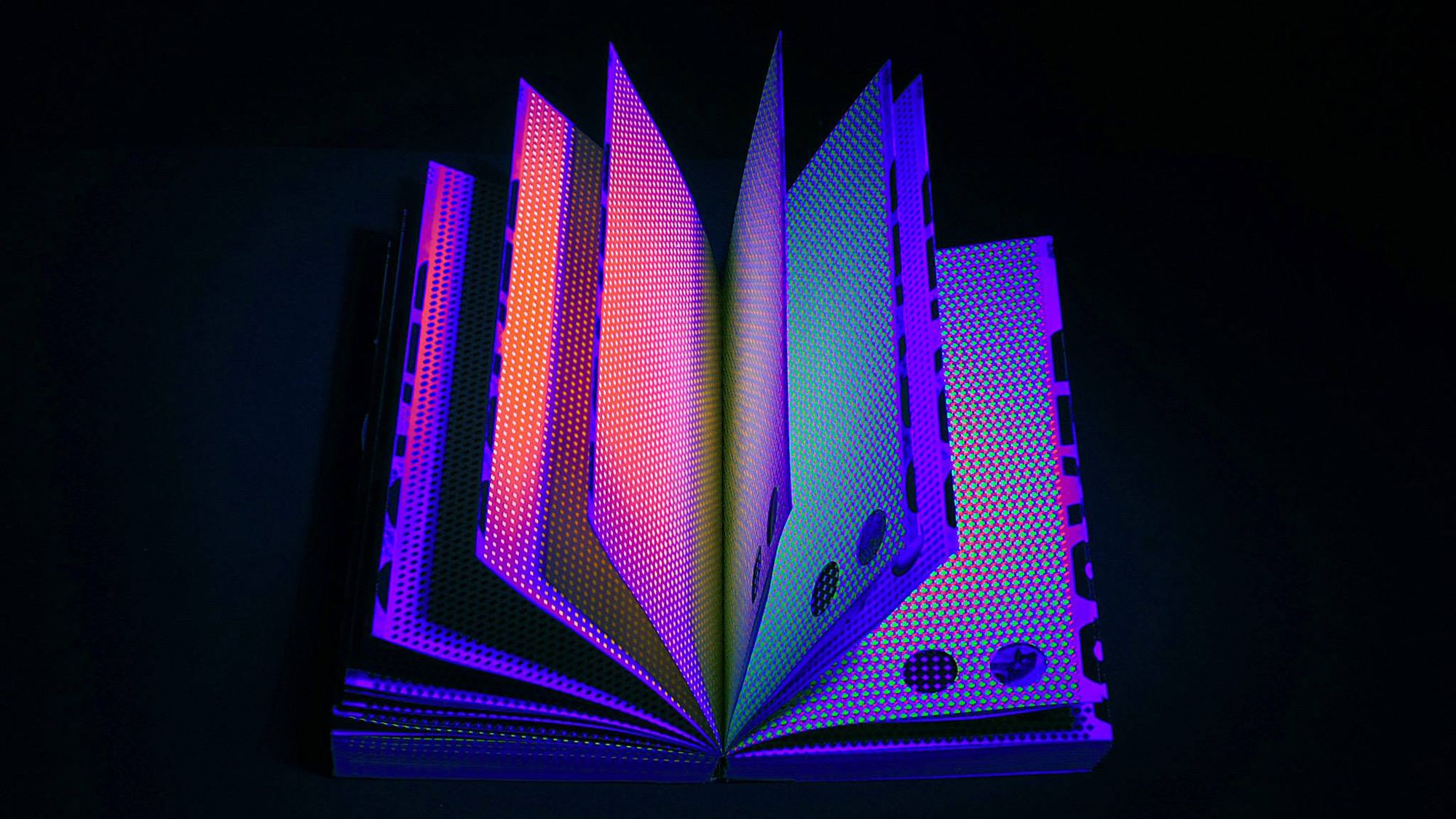 Собрана она как french fold — снаружи паттерн, внутри контент. Чтобы прочитать его, листы нужно разрезать, и она уже никогда не будет прежней. Пасхалка — печать флуоресцентными красками.