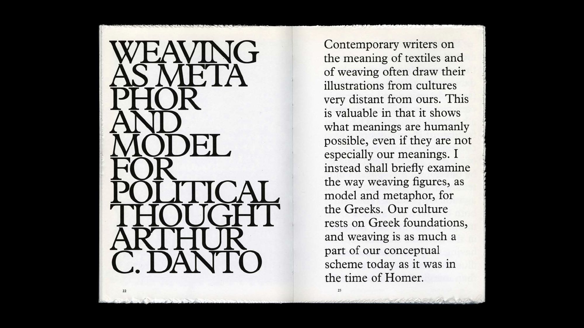 Начинается она с текста Артура Данто. Заголовок — Weaving as Metaphor and Model for Political Thought — во всю страницу, а далее, с каждой новой страницей, кегль уменьшается. Этот прием Ирма Блум использовала как приглашение к чтению: вы быстро пробегаете взглядом эти необычные страницы с небольшим количеством текста и — внезапно обнаруживаете себя захваченным чтением полноценного лонгрида.