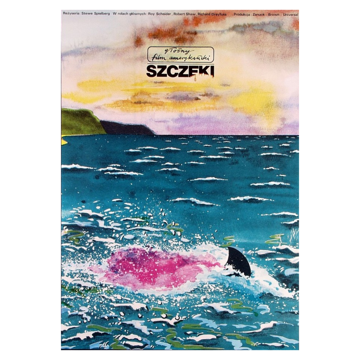 Иногда тема обыгрывалась более изощренно. Во всем мире с плаката к фильму «Челюсти» скалила зубы акула. Наш Анджей Дудзинский предложил полную обаяния парафразу «Падения Икара» Брейгеля. Море, небо, спинной плавник. И только розовый кильватер свидетельствует о драме, которая здесь произошла.