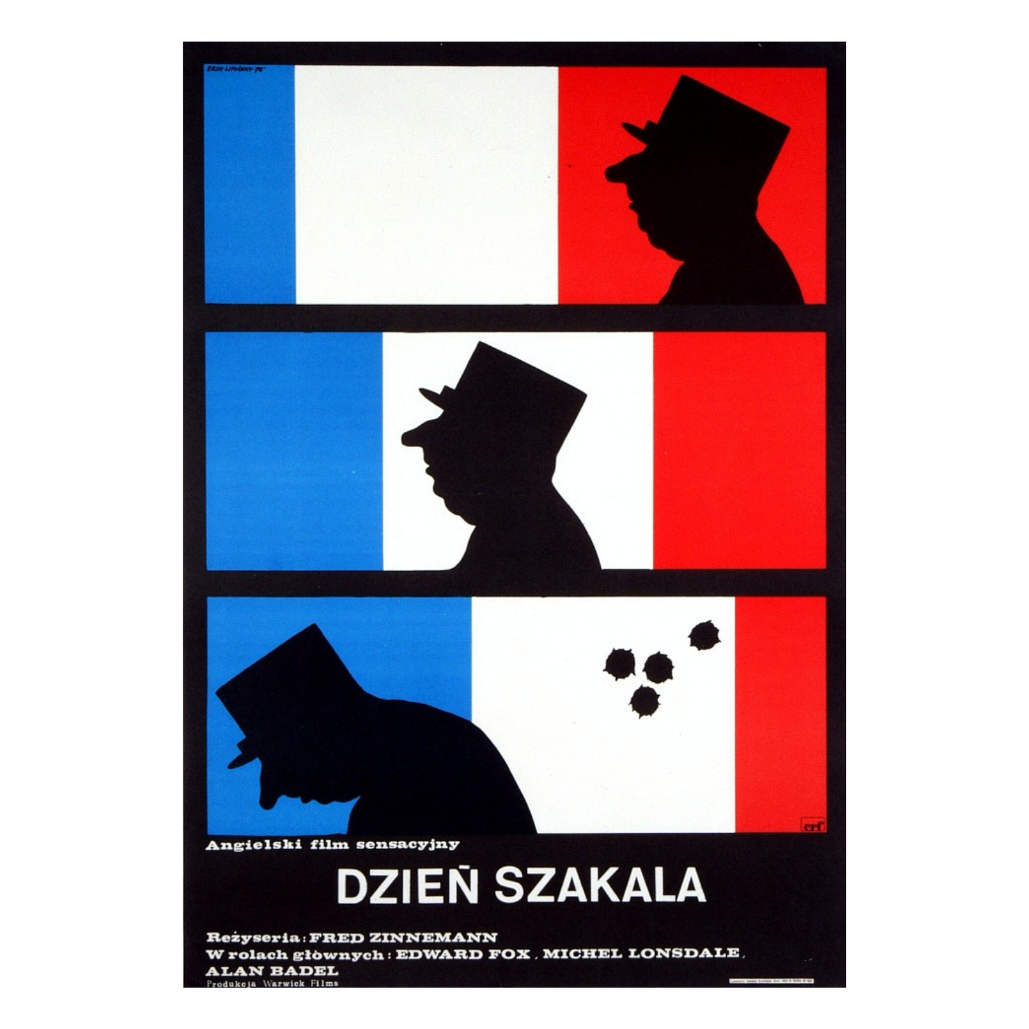 На польском плакате к фильму «День шакала» мы видим историю в картинках. Последовательность из трех кадров. На первых двух изображен силуэт де Голля навытяжку (огромный носище, кепи, на заднем плане — французский флаг). На третьем рисунке голова генерала опущена, а за спиной государственного мужа разрываются четыре черные кляксы. Это отсылка к кульминационной сцене фильма: Эдвард Фокс нажимает на курок в тот момент, когда генерал (цитирую по литературному первоисточнику): «торжественно приложился губами к щеке ветерана».