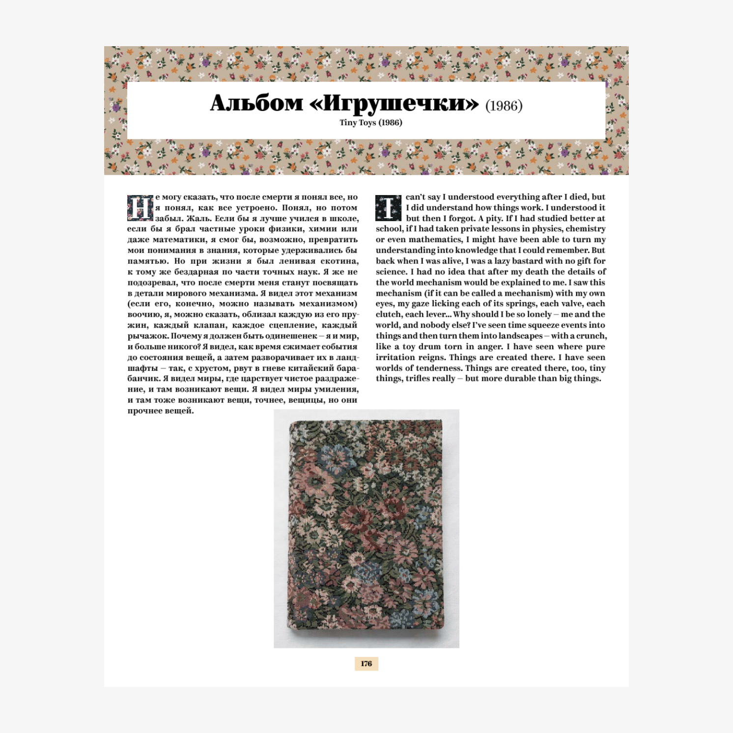 «Не могу сказать, что после смерти я понял все, но я понял, как все устроено. Понял, но потом забыл. Жаль. Если бы я лучше учился в школе, если бы я брал частные уроки физики, химии или даже математики, я смог бы, возможно, превратить мои понимания в знания, которые удерживались бы памятью. Но при жизни я был ленивая скотина, к тому же бездарная по части точных наук. Я же не подозревал, что после смерти меня станут посвящать в детали мирового механизма. Я видел этот механизм (если его, конечно, можно называть механизмом) воочию, я, можно сказать, облизал каждую из его пружин, каждый клапан, каждое сцепление, каждый рычажок. Почему я должен быть одинешенек — я и мир, и больше никого? Я видел, как время сжимает события до состояния вещей, а затем разворачивает их в ландшафты — так, с хрустом, рвут в гневе китайский барабанчик. Я видел миры, где царствует чистое раздражение, и там возникают вещи. Я видел миры умиления, и там тоже возникают вещи, точнее, вещицы, но они прочнее вещей».
