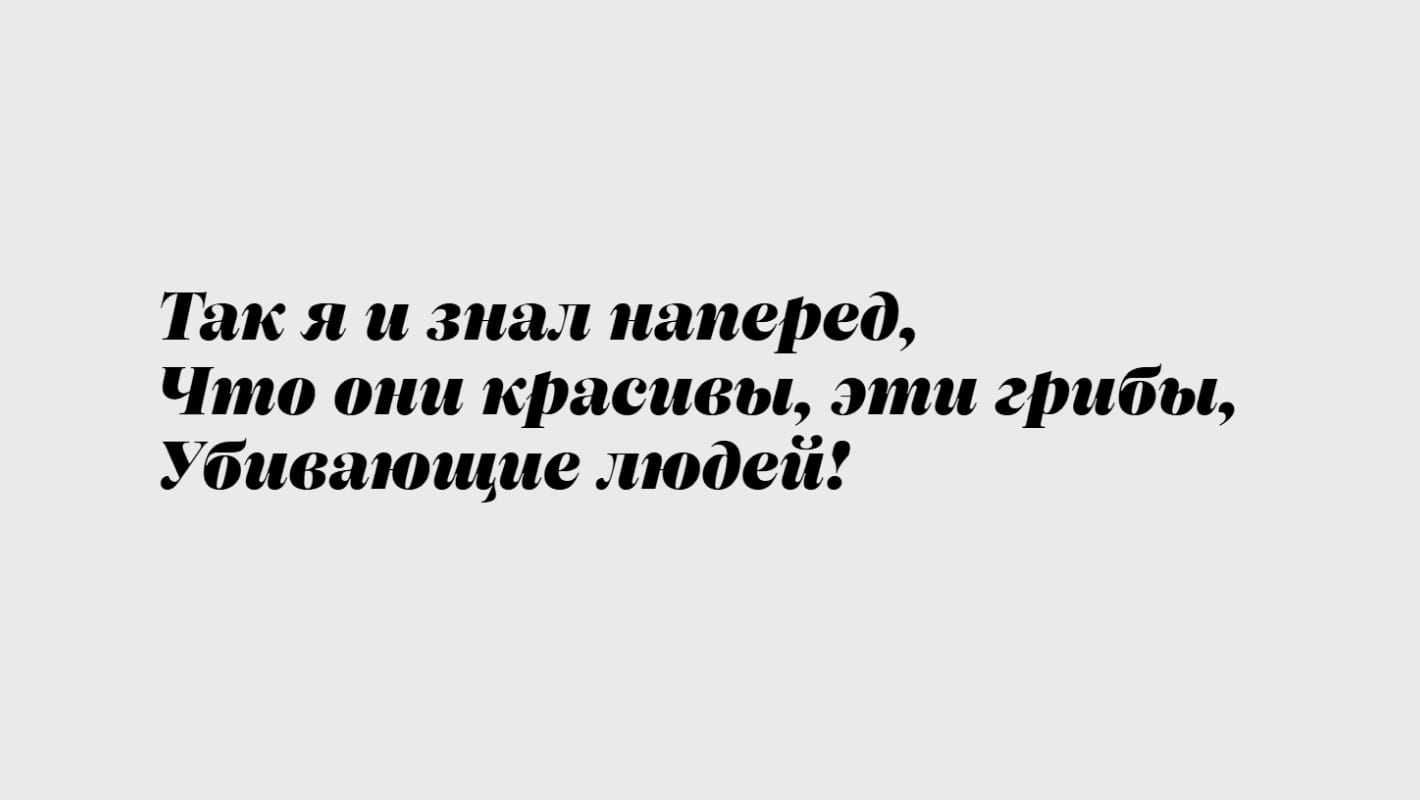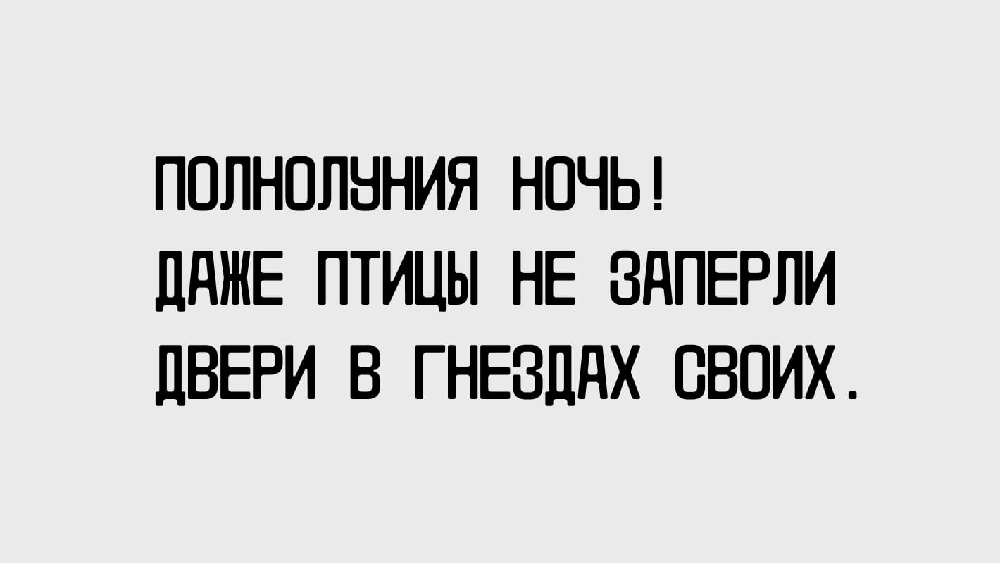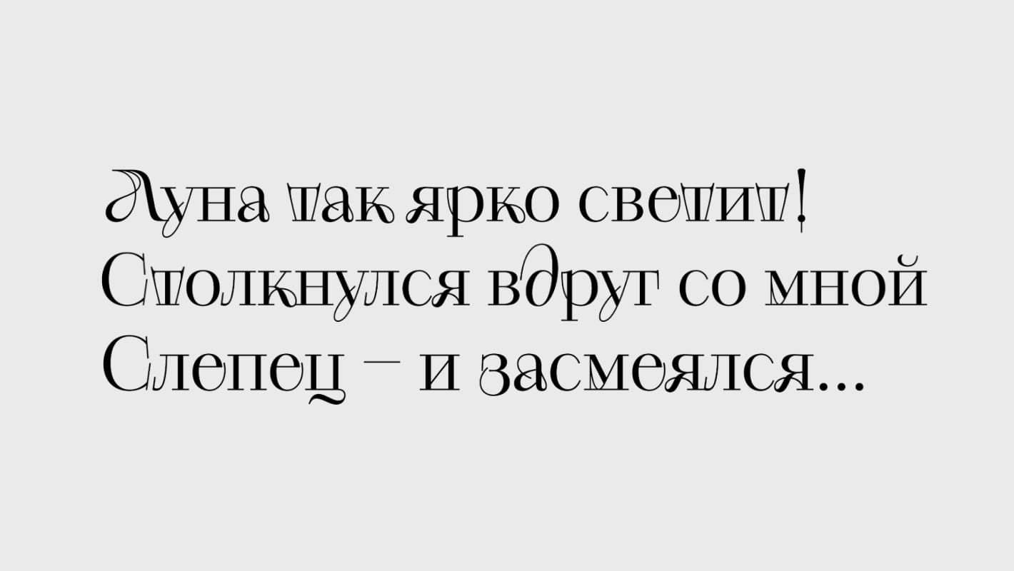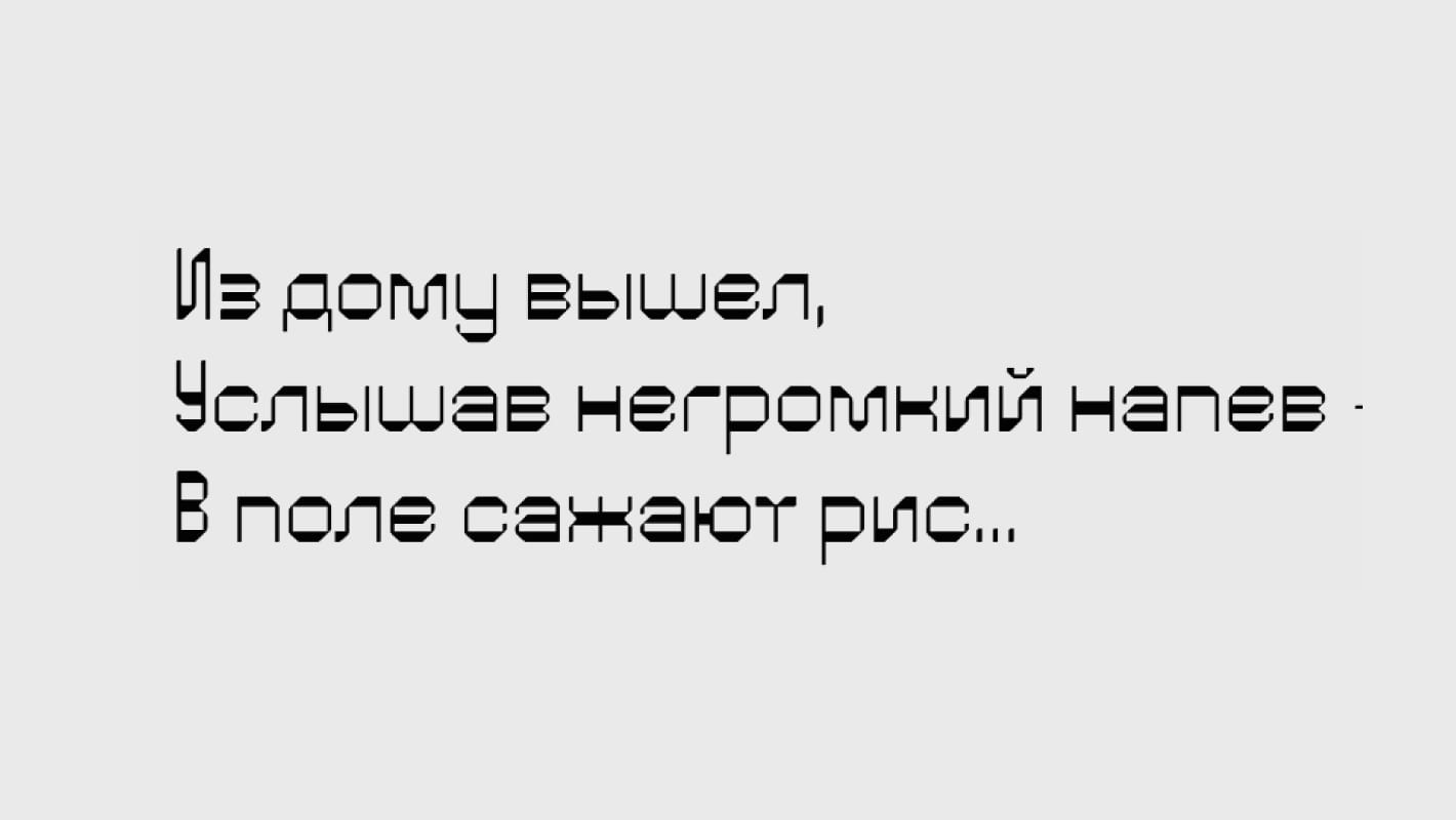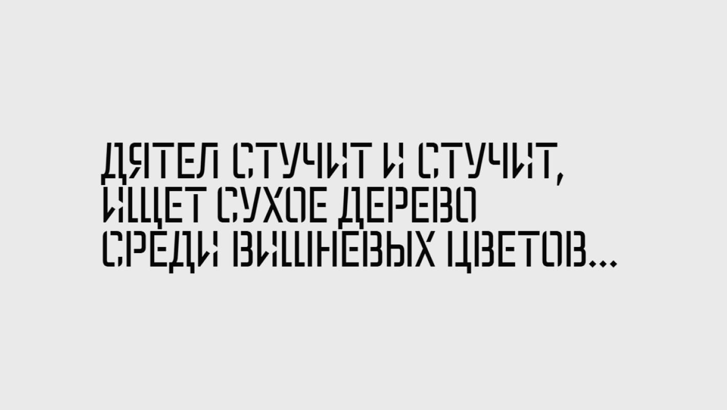 Шрифт родился из желания экспериментировать с буквами. Говорят, набранное этим шрифтом не нужно читать, — только любоваться. Если правильно подобрать слова, то буквы становятся паттерном.