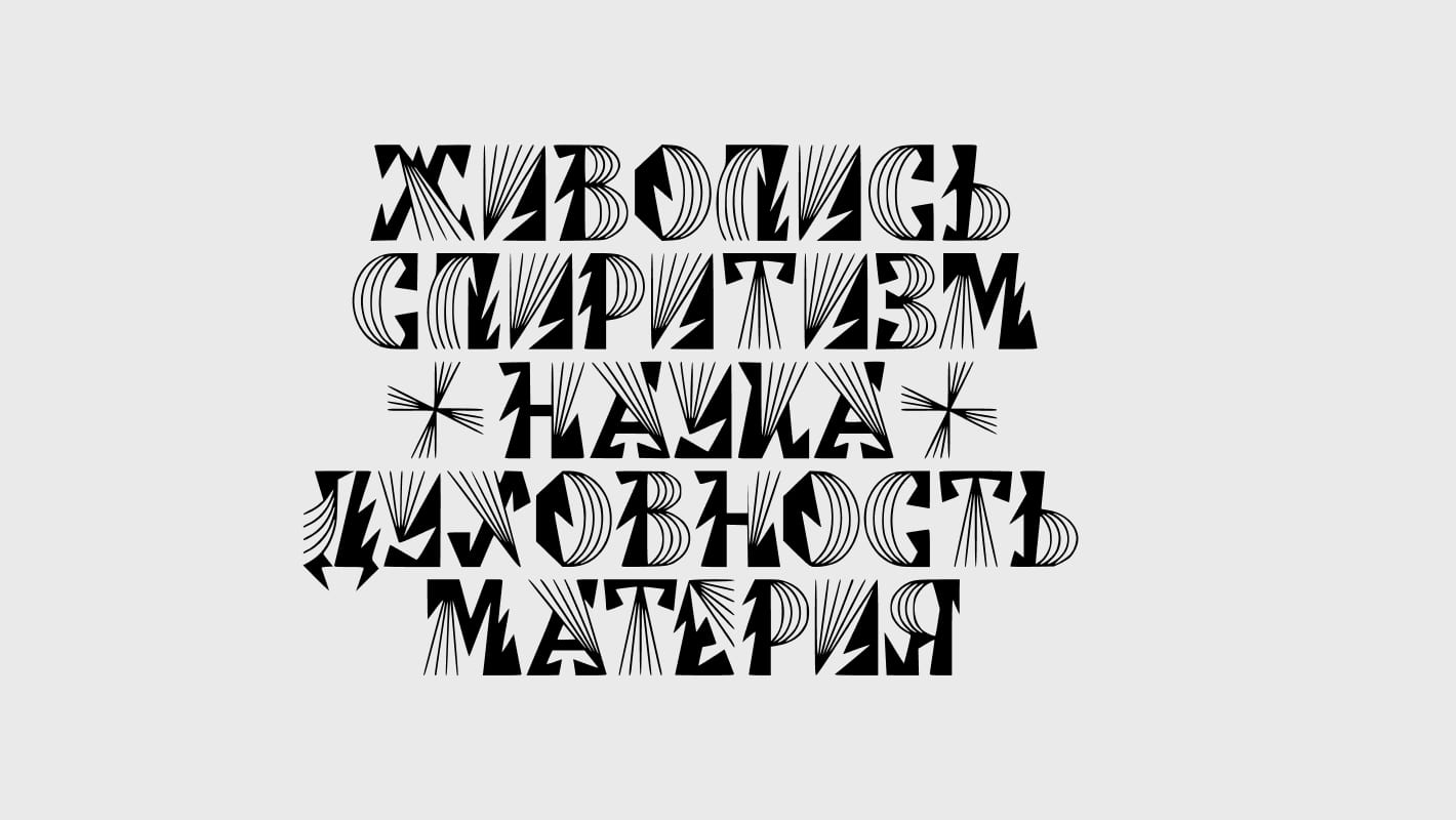 Шрифт для выставки «Лучизм: иконография невидимого», посвященной научным, философским и духовным открытиям XIX–XX веков, которые помогли сформировать основу концепции живописного лучизма Михаила Ларионова и Натальи Гончаровой.