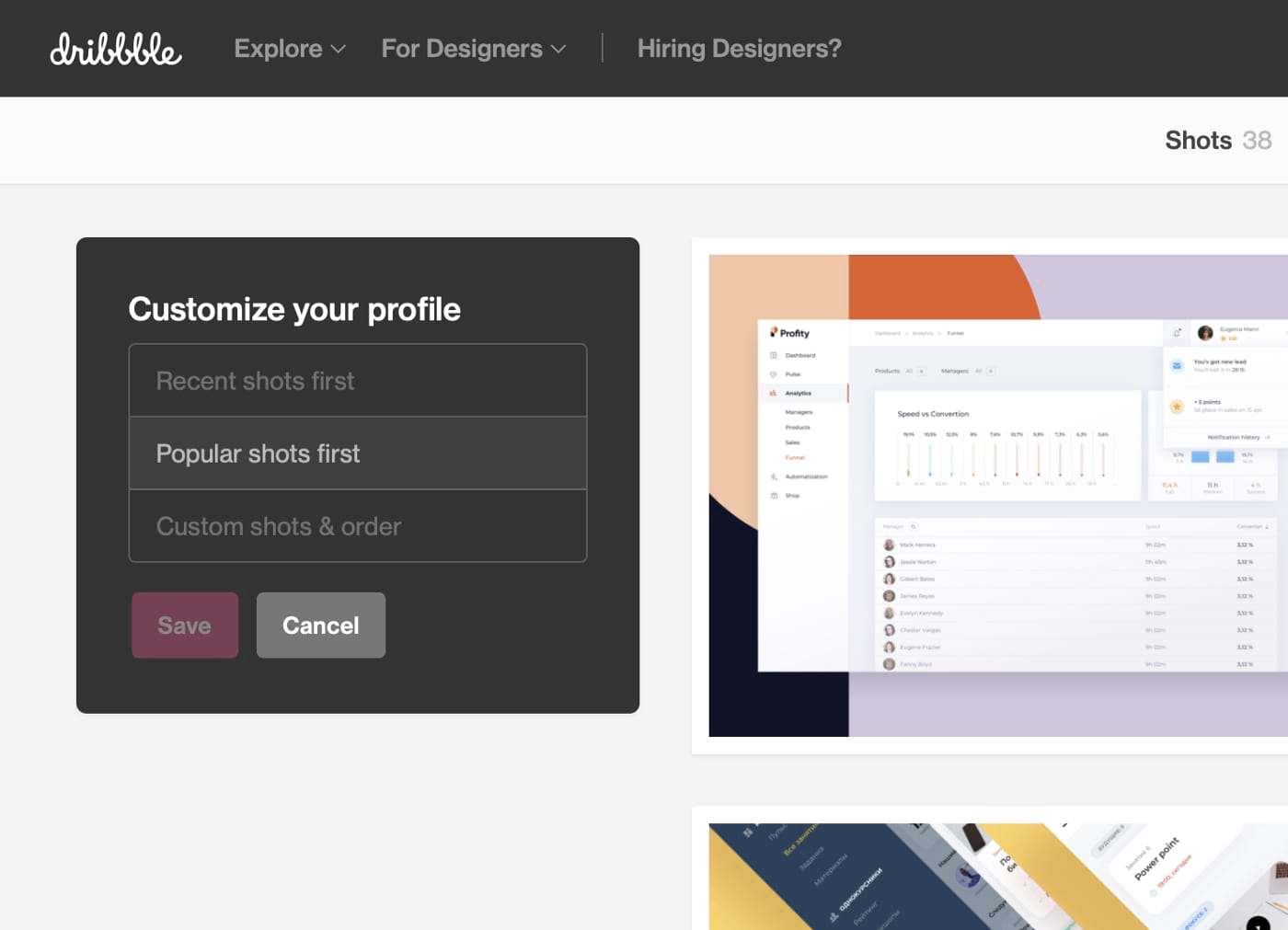 Совет 4: кастомизируйте свой профиль. В Dribbble есть возможность организовать свое портфолио так, чтобы самые популярные шоты были сверху. Это сделает ваш аккаунт привлекательнее.