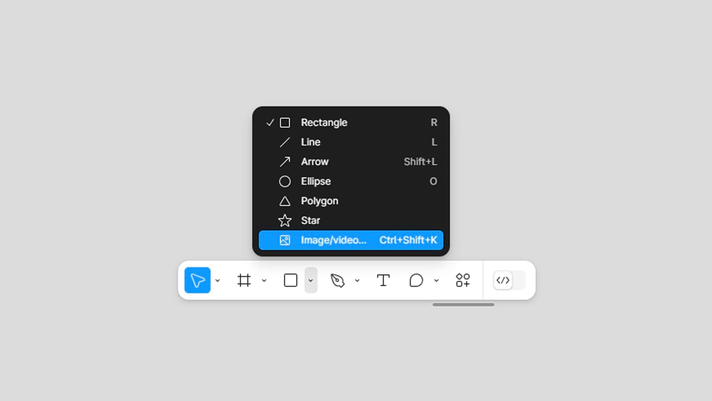 Можно воспользоваться нижней панелью инструментов: вызвать контекстное меню рядом с иконкой квадрата и выбрать последний пункт Image/Video. Так вы откроете окно для выбора изображения. Это же действие удастся выполнить горячими клавишами Ctrl + Shift + K.