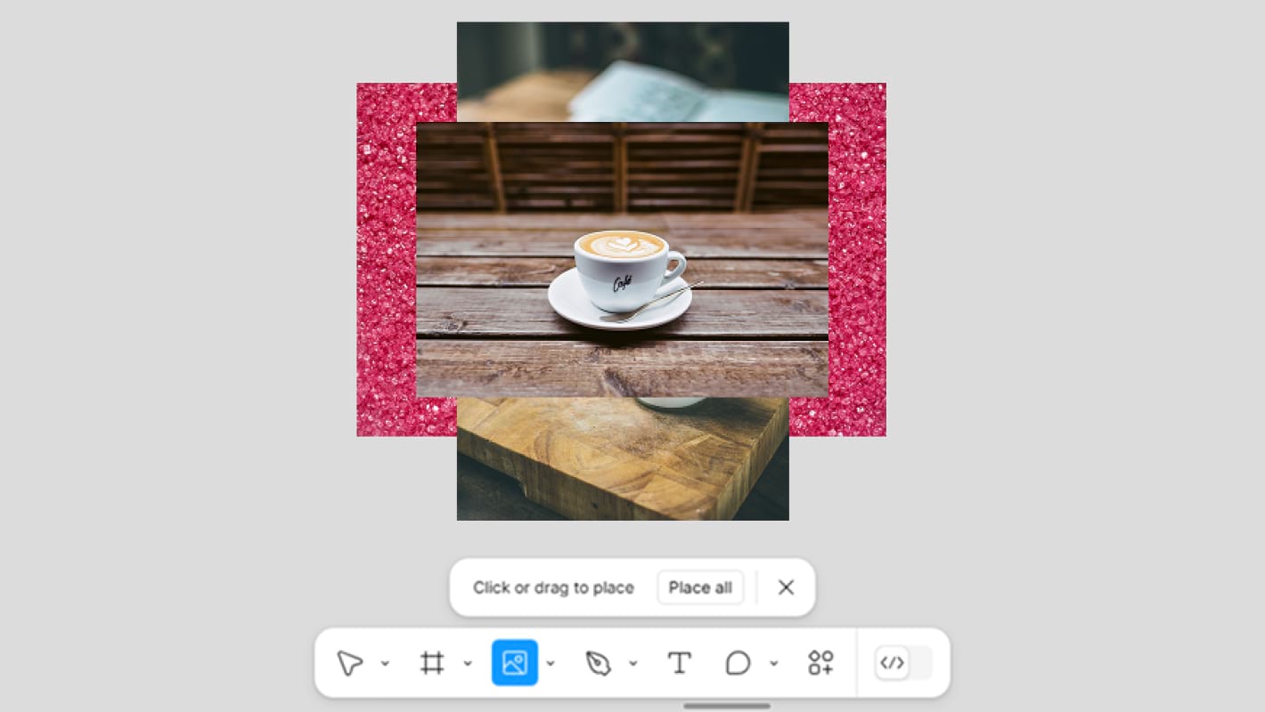 Если одновременно выделить несколько файлов, зажимая Ctrl, получится вставить их в макет все сразу. Картинки будут добавляться последовательно по клику: можно выбрать для каждой нужное место. В нижней части интерфейса появится окно с подсказкой и кнопкой Place all: если нажать на нее, все изображения одновременно появятся по центру экрана.