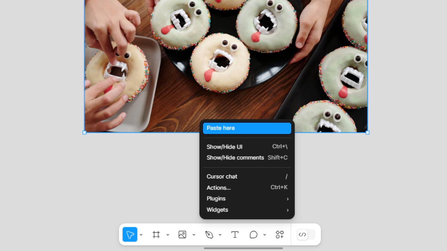 Наконец, можно скопировать изображение из папки или из другого файла Figma с помощью клавиш Ctrl + С. А затем вставить в нужное место: зажать Ctrl + V или кликнуть правой кнопкой мыши на рабочую область и в открывшемся меню выбрать Paste here.