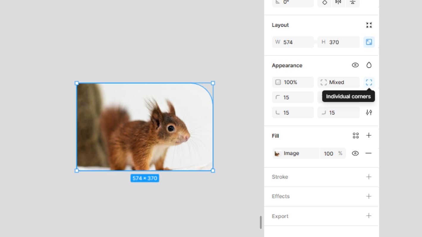 Если кликнуть на иконку с уголками, появится синяя подсветка — так вы активируете опцию Individual Corners. Откроются четыре новых поля, где можно ввести отдельное значение скругления для каждого угла. Теперь, если кликнуть по одному из углов на картинке и тянуть его к центру, скругляться будет только один выбранный угол. А если захотите таким методом скруглить все углы, нужно зажимать Alt.
