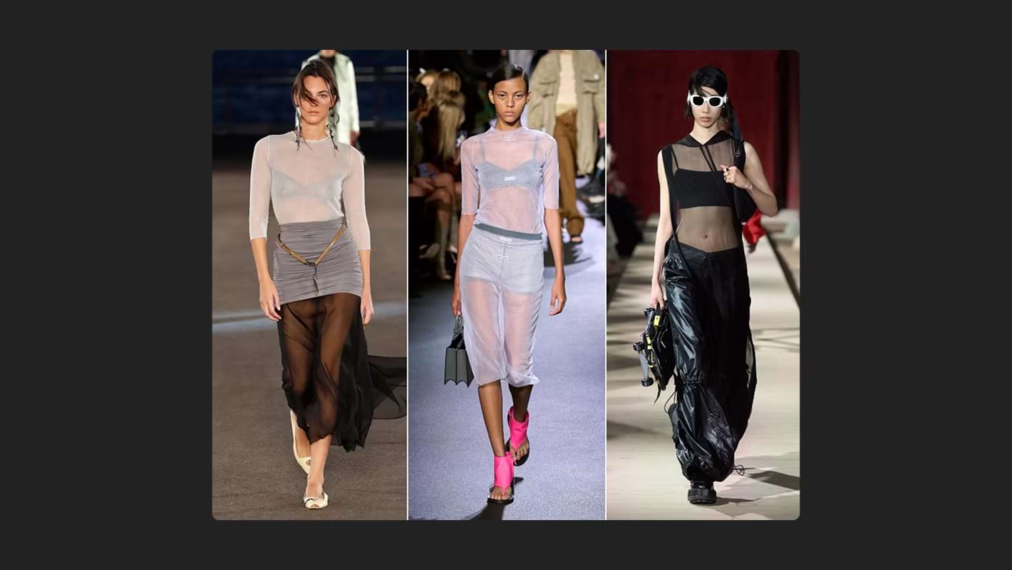 - Полупрозрачные ткани. Платья, топы, рубашки, джемперы, брюки из сетчатых материалов, украшенных блестками. Вещи могут быть также с эффектом голографии, деграде.