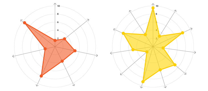 Эта диаграмма строится на круглой системе координат. Каждая переменная обозначена точкой, у нее есть своя ось, которая начинается в центре круга. По нескольким точкам строится замкнутая область. Радарная диаграмма нужна, чтобы оценить объект по нескольким факторам. Так можно визуализировать успеваемость ученика по разным предметам или качество товара по нескольким характеристикам.
