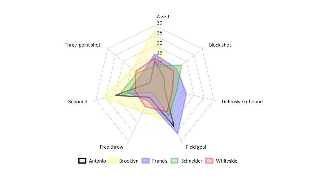В одной системе координат можно построить несколько радарных диаграмм для сравнения. На примере ниже спортсменов сравнивают между собой по нескольким навыкам.