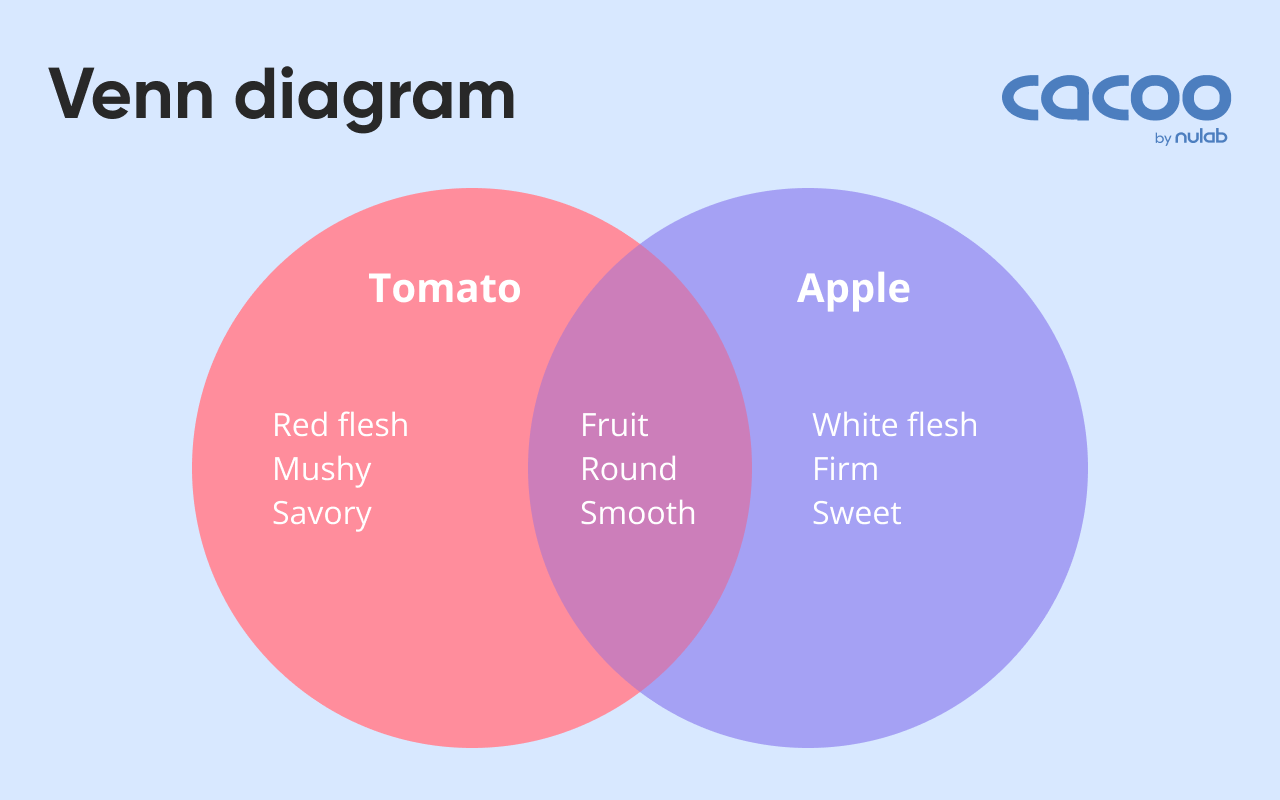 Представляет собой несколько пересекающихся кругов и показывает пересечения множеств. Диаграмма ниже показывает, что общего есть у яблок и томатов и чем они различаются: