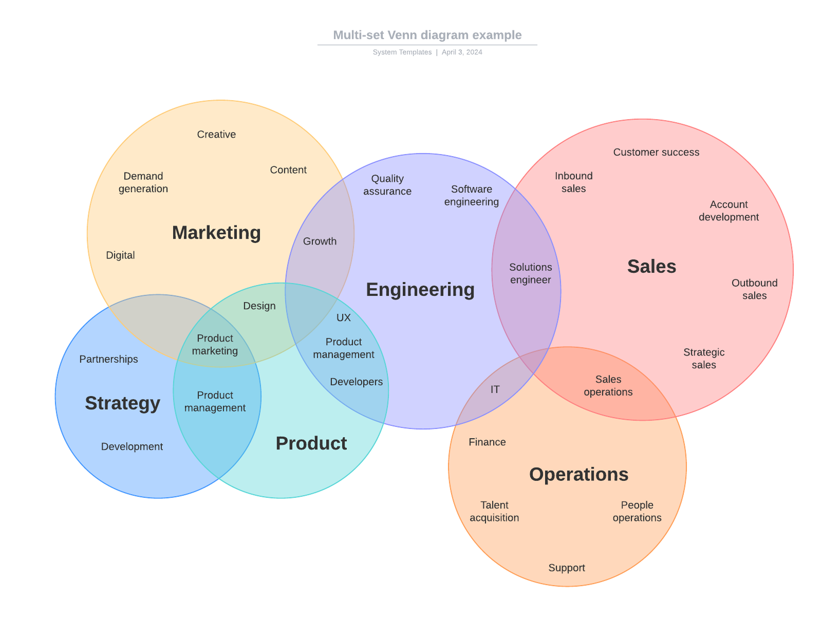 Диаграммы Венна могут быть более сложными: сами множества бывают разных размеров, области их пересечения тоже. В следующем примере визуализированы навыки, необходимые в разных сферах деятельности. Некоторые из них актуальны сразу для двух или трех сфер.
