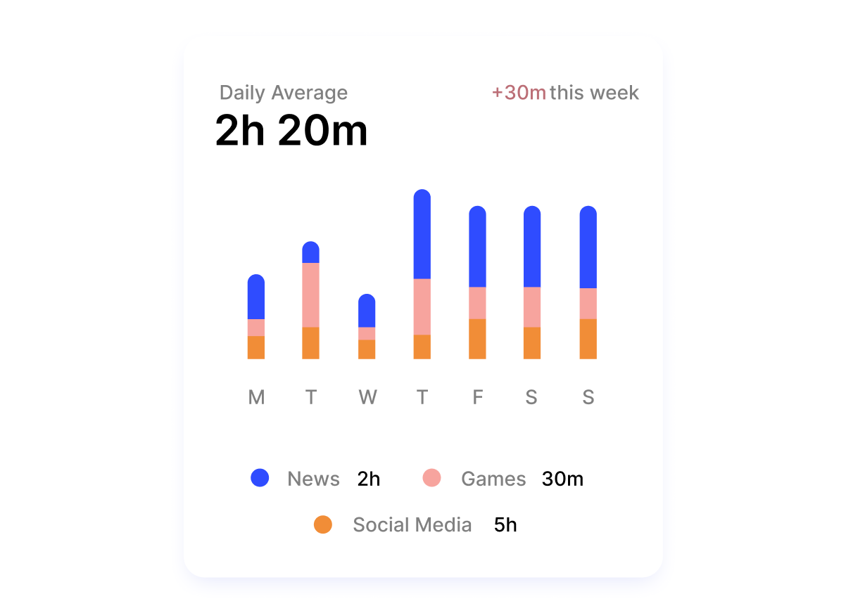 Еще одна разновидность этой диаграммы — барчарт с накоплением. В этом случае каждая полоса поделена на несколько отрезков. Если с помощью обычного барчарта можно показать траты за неделю по дням, барчарт с накоплениями продемонстрирует, какое количество денег уходило на разные группы товаров в каждый из дней. А на примере ниже диаграмма показывает экранное время, и на что именно оно было потрачено.