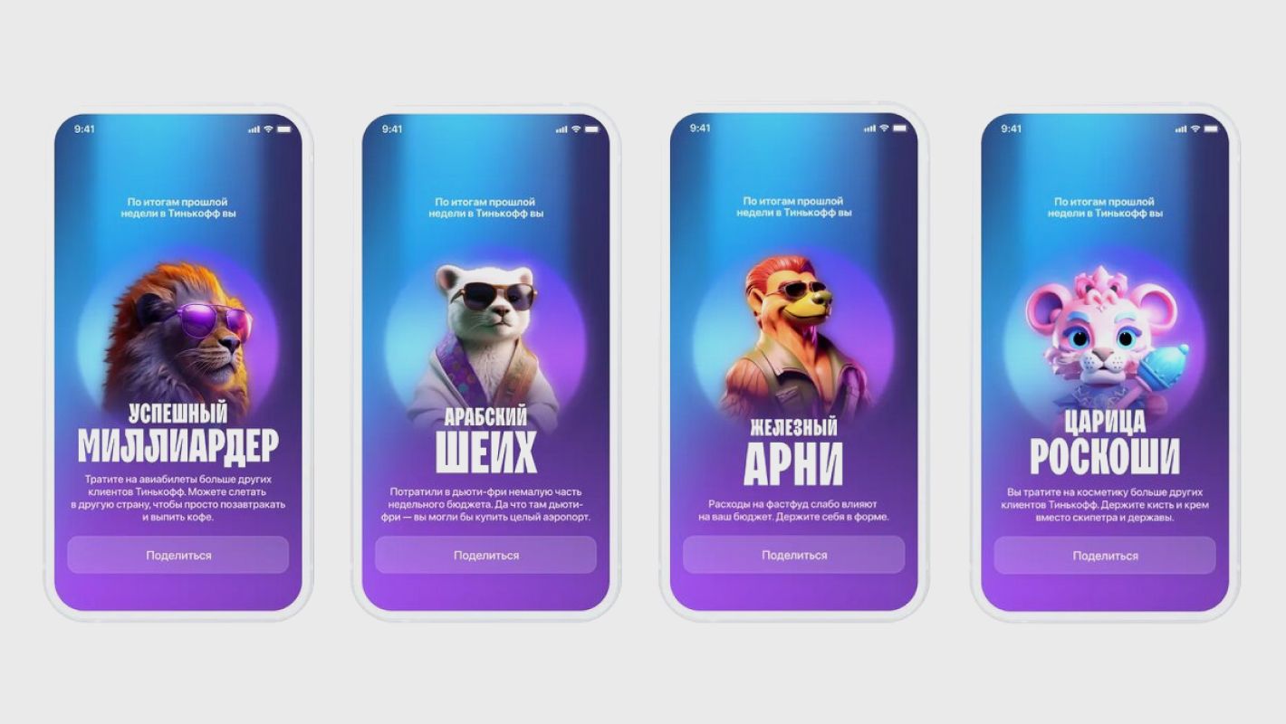 Фирменный стиль банковских приложений редко ассоциируется с эмоциональным контентом, но формат сторис позволяет сделать сухую аналитику визуально дружелюбной и доступной.