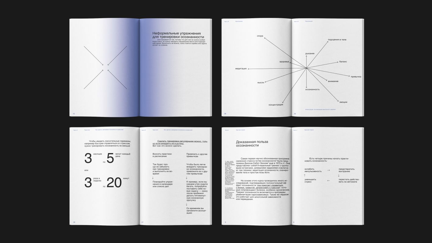 Эту проблему я взяла за основу и подумала, что буклет с практическими советами может быть решением. Контент я взяла из статей экспертов в сфере. Я старалась компоновать текст небольшими объемами, чтобы тем, кому сложно сконцентрироваться, легче было читать.
