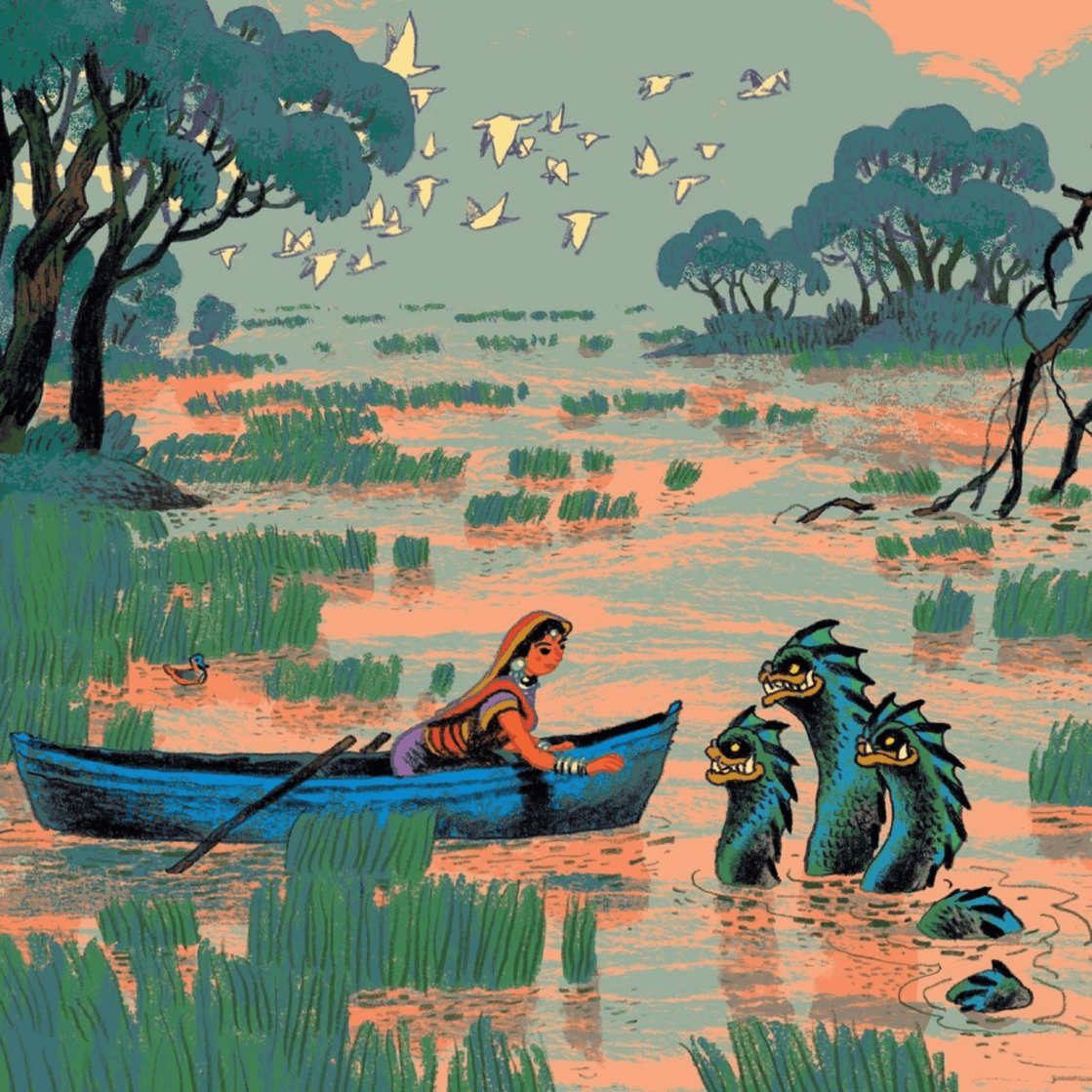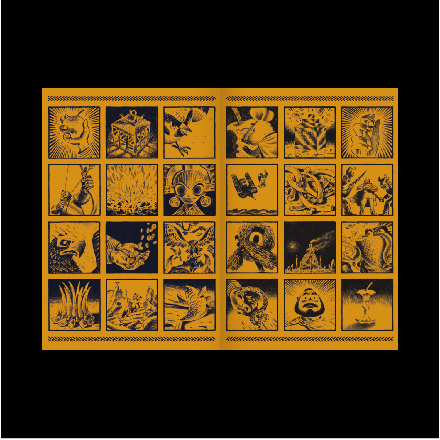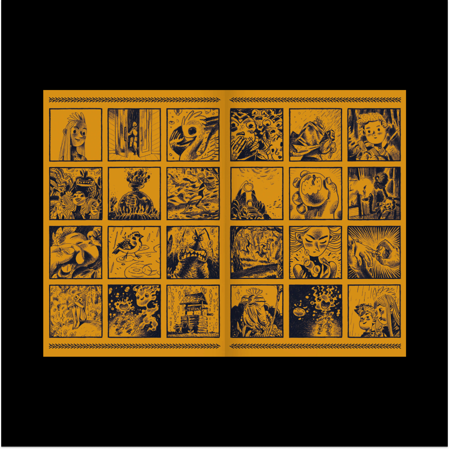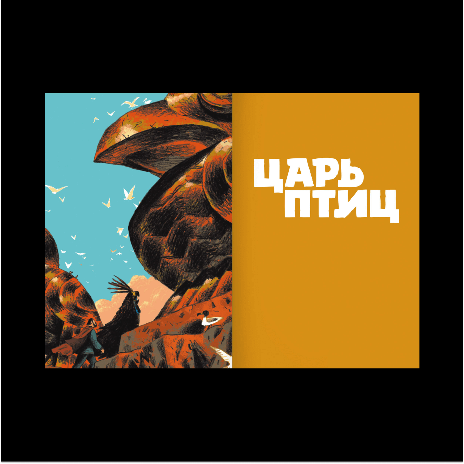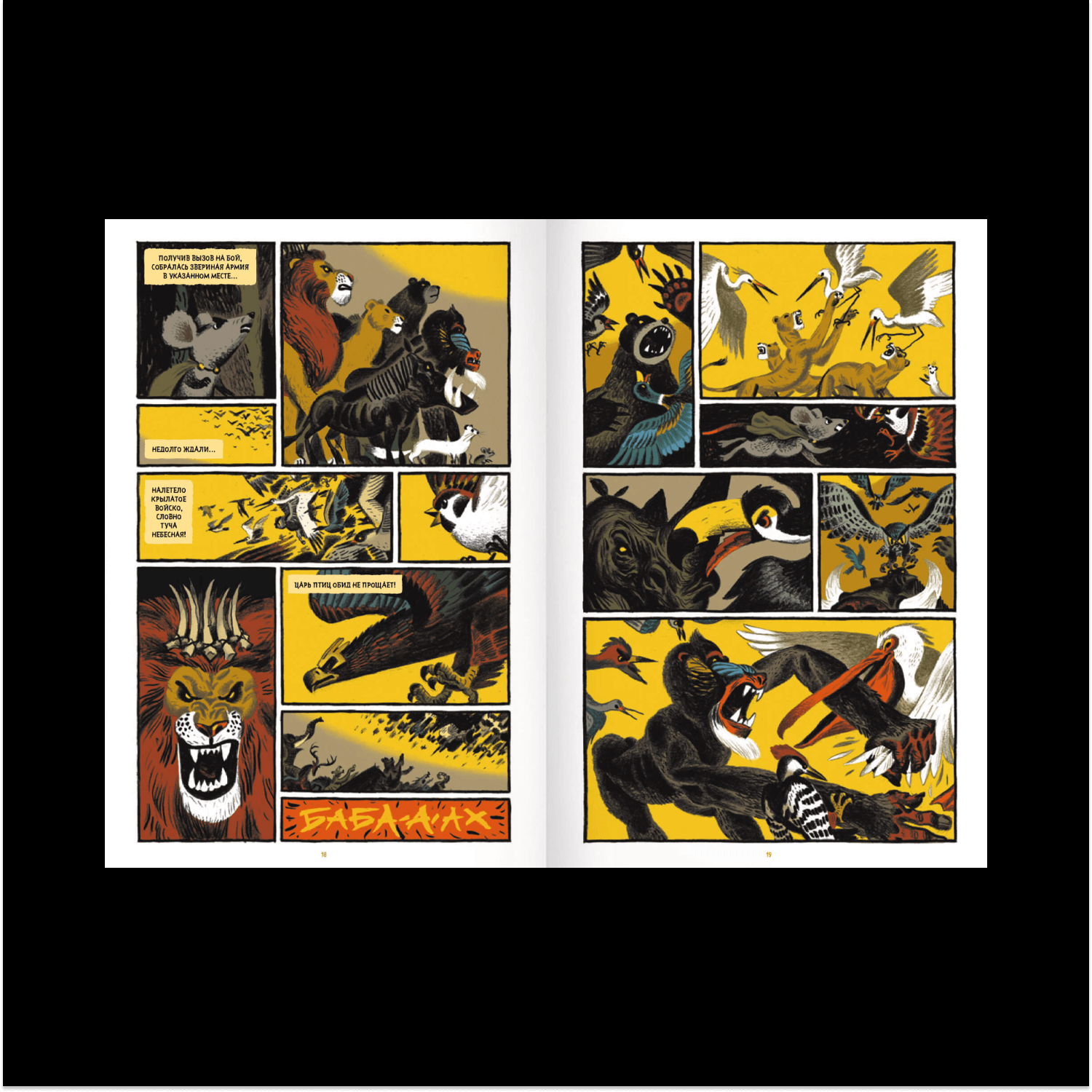 Сирин, Алконост и Гамаюн — три фольклорные птицы, которые отвечают за разные аспекты мифотворчества. Гамаюн — птица с человеческим лицом, которая все ведает и правду всем рассказывает. Я ввел ее, чтобы объединить разные сюжеты в одну сказку. Гамаюн выступает в роли рассказчика и только она всегда присутствует на страницах книги. Остальные появляются, играют свою роль и уходят. Помимо этого у Гамаюн есть важная для меня функция — все, что я не хочу рисовать, я могу вложить в ее уста. Она говорит: «И вот прошло три года», и мне не нужно рисовать три года.