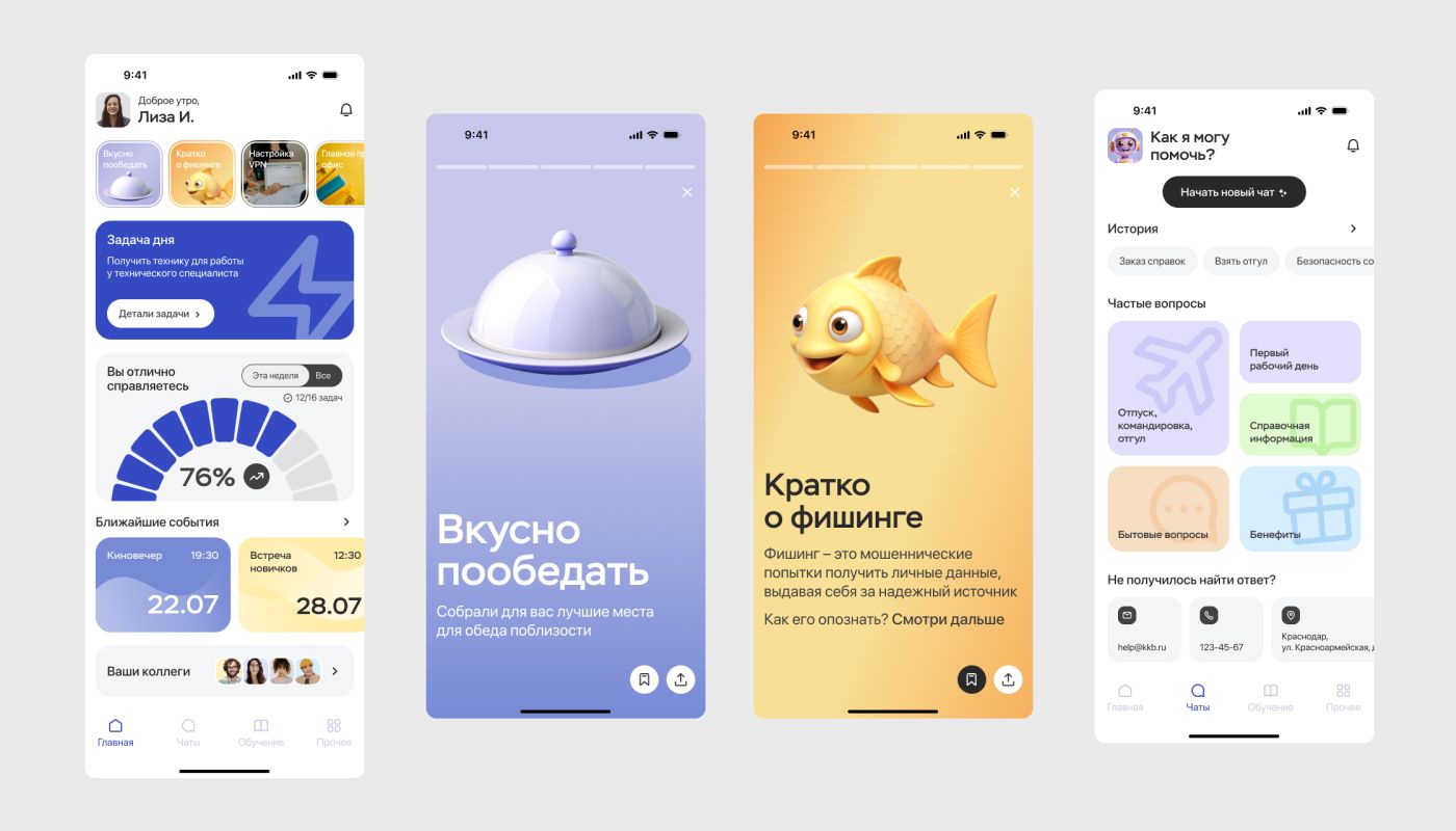 На последнем модуле мы делали приложение онбординга для банковских сотрудников. Так совпало, что параллельно я проходила свой онбординг на работе и тематика кейса мне откликнулась. Мы работали над кейсом в команде, и сейчас приятно вспоминать наши общие созвоны, хотя в моменте командная работа давалась мне непросто. На работе ты один дизайнер в команде, а тут вас четыре-пять, и у каждого есть свое мнение о том, как сделать лучше. Думаю, что договориться и прийти к общему решению — это классный навык, который развивается в процессе.