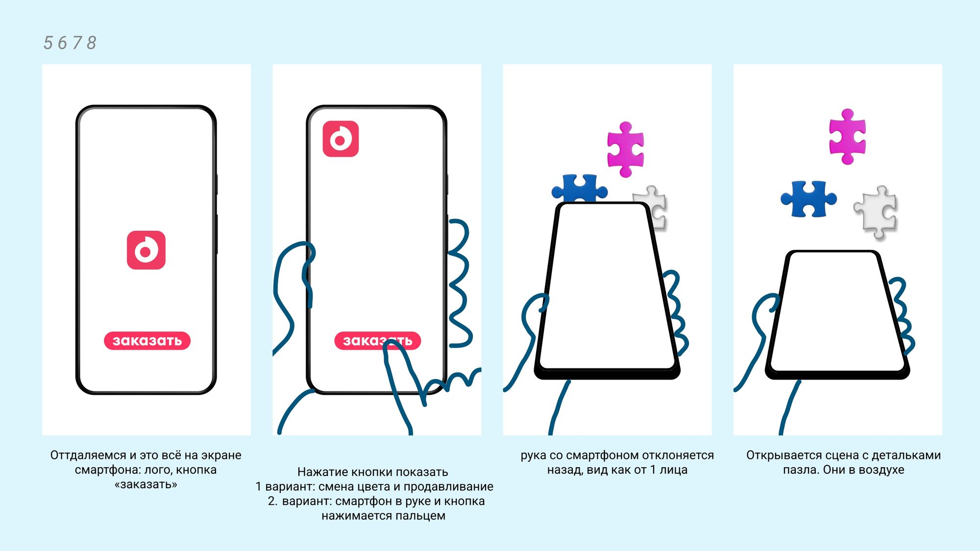 В один из сюжетов был заложен глубокий философский смысл про пазлы и время. Одна из ценностей компании звучит так: «Мы возвращаем людям время». Я подумала, что детальки пазла, как минутки, и если потерять одну, то картинка уже не сложится. Пять минут имеют значение, если ими распорядится обдуманно. Самокат помогает перераспределить минутки так, чтобы они не потерялись. И люди могли уделять больше внимания своим важным делам или приятно проводить время с близкими. Я даже считала это основной мыслью всей моей концепции, но часть про пазлы я не успела сделать к презентации проекта для представителей Самоката. И думала, что уже нет смысла пытаться. Но в процессе доработки по замечаниям все же рискнула добавить пазлы, пусть даже это неочевидный посыл.