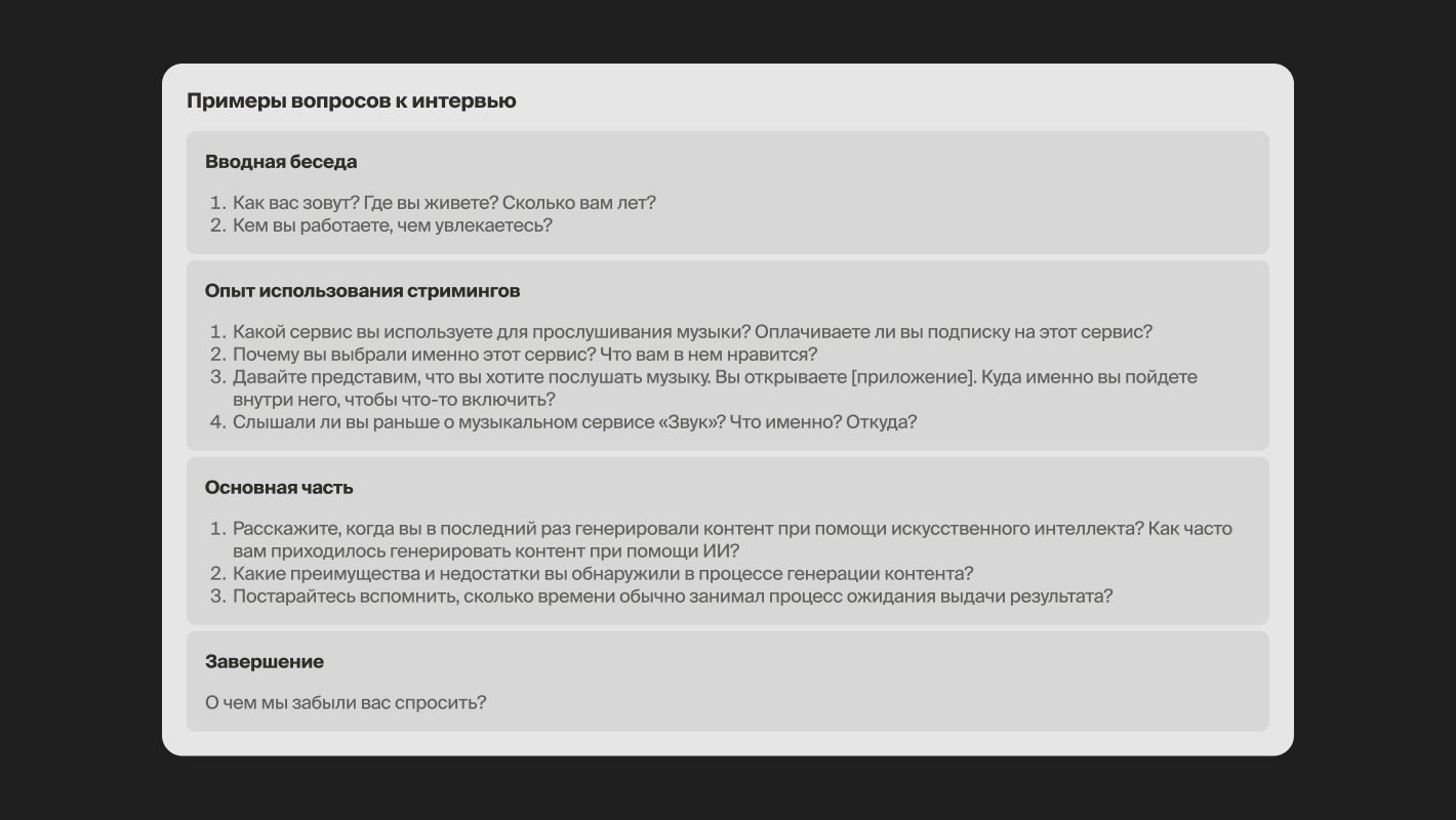 Помогают понять поведение и мотивы пользователя через ответы на вопросы: почему, зачем, как именно. Методов качественного исследования много, но вполне будет достаточно одного — интервью. Обычно для интервью отбирают около десяти респондентов.
