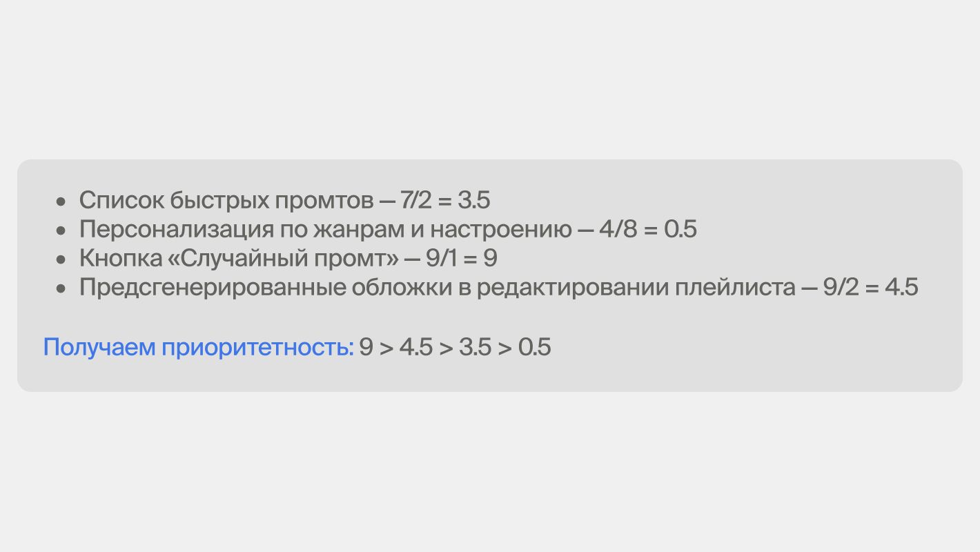 Совместно с командой оцените каждый из двух параметров и посчитайте по формуле: IE = Impact/Effort. Чем выше получится значение, тем приоритетнее будет задача.
