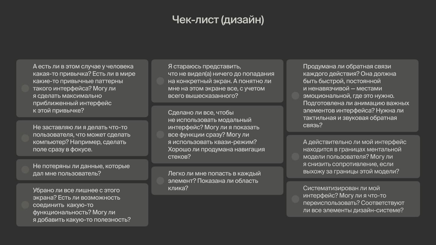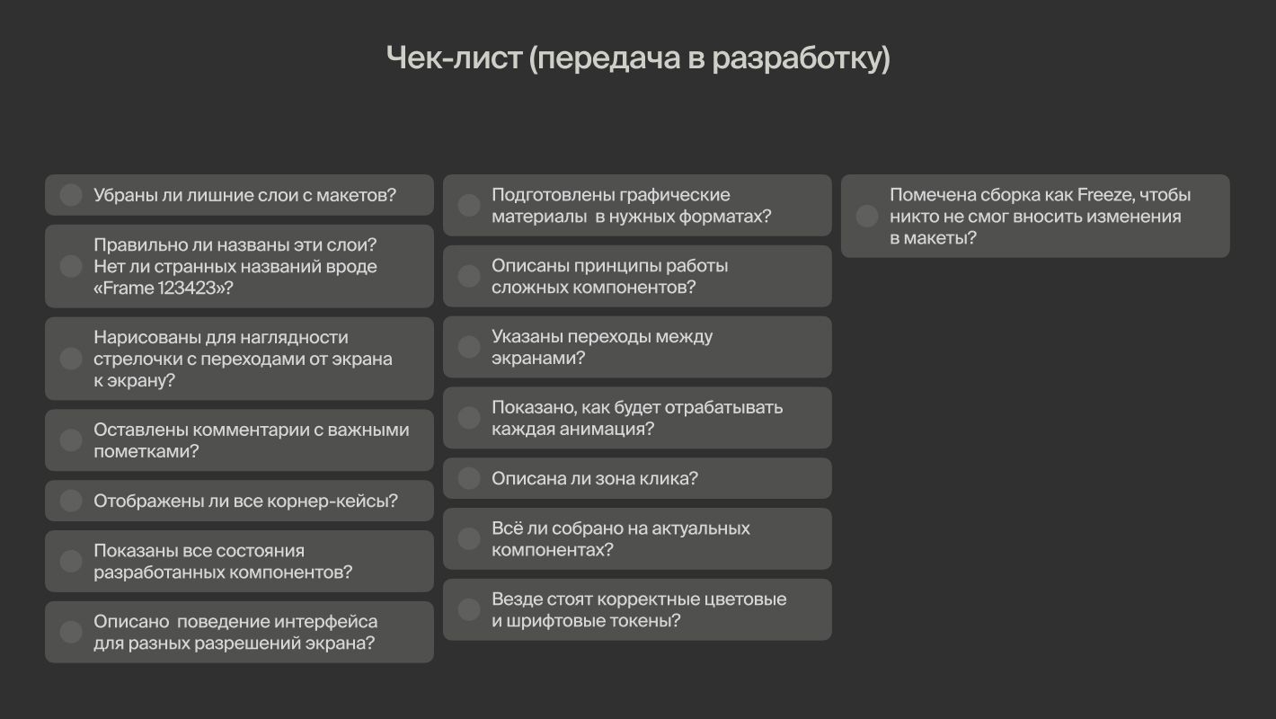 Поэтому лучше несколько раз проверить макеты до того, как они окажутся у разработчиков, чтобы потом не приходилось все переделывать. Для этого используйте чек-лист.