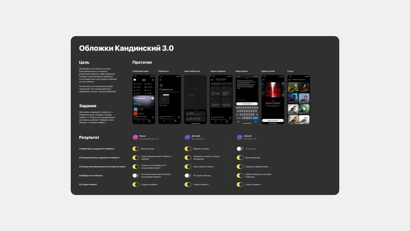 Вводные. С развитием социализации в «Звуке» плейлисты стали попадать в публичную выдачу, а люди стали добавлять их к себе в коллекцию. Сейчас у плейлистов нет достаточной визуальной самостоятельности. Разрабатываем модуль создания обложек для плейлистов при помощи нейросети «Сбера» — «Кандинский 3.0», увеличивая вовлечение пользователя в создание плейлистов, их количество и возвращаемость пользователей в существующие плейлисты.