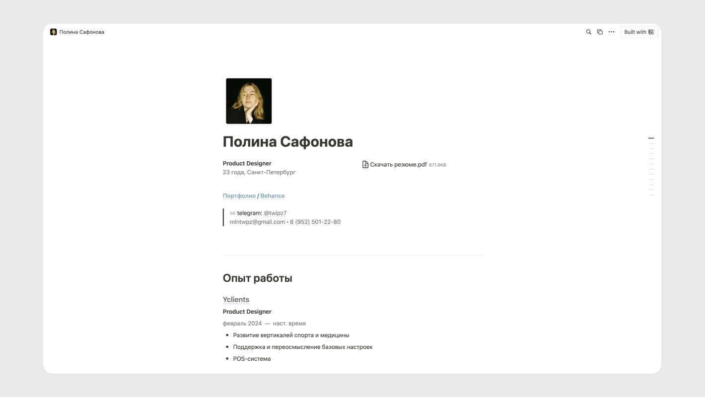 Изначально я собрала сильные портфолио и резюме. Смотрела на примеры других ребят, которые уже работают в продукте. Даже не зная структуры, я собирала их по наитию. Потом посмотрела вебинары от Карьерного центра BBE. И это было суперполезно, потому что HR со своей стороны показывает, как ему удобно смотреть резюме и портфолио. Так я узнала, как упростить ему работу, чтобы повысить свои шансы.