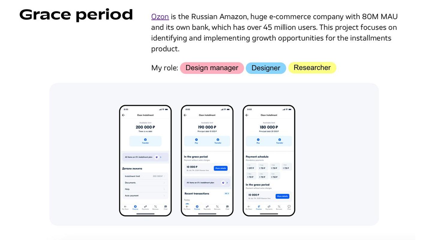 Во-вторых, в финтехе есть четкая тенденция, что важен не просто опыт работы дизайнером в крупном продукте, а опыт в похожих местах с близким продуктом. Например, опыт работы в банке над мобильным приложением и дебетовым B2C-продуктом.