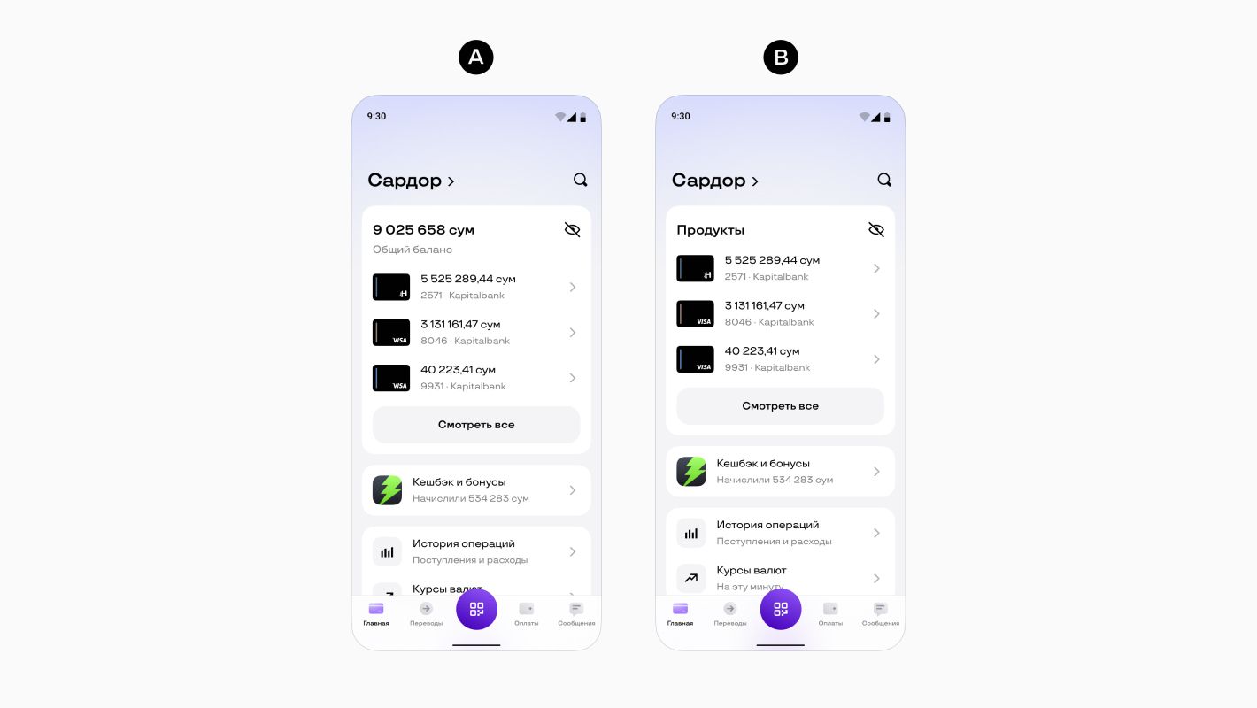 Чтобы это проверить, я разделил респондентов на две группы по десять человек. Обе группы выполняли один и тот же сценарий: оплатить покупку в магазине техники на 6 500 000 сум по QR-коду. Общей суммы хватало, но на каждой отдельной карте — нет. В обоих вариантах баланс был скрыт по умолчанию. Тестирование проводилось на одной из самых популярных моделей телефона в Узбекистане.В группе A люди видели общий баланс на главном экране. В группе B общего баланса не было — вместо него были балансы на конкретных картах: